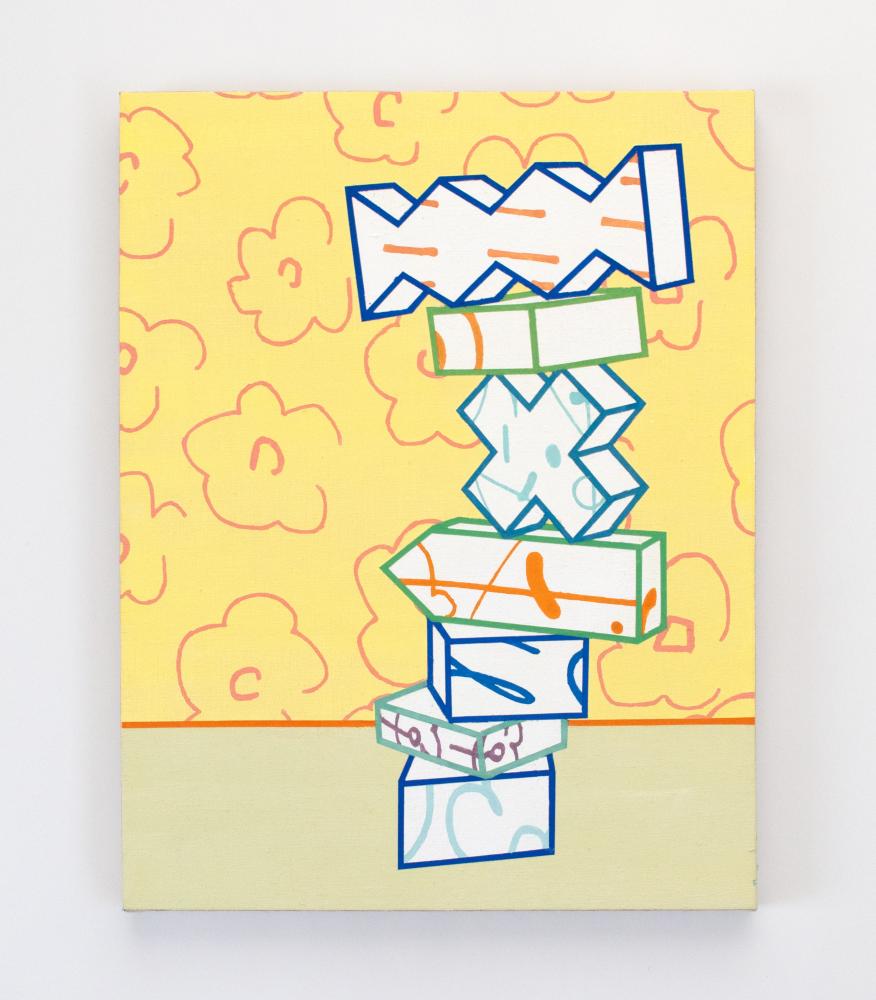 厚紙で作ったブロックやドローイングを描いた布などを組み合わせて構成する。 それらは自分のイメージの設計図でありながら、建物のようになったり、街のようになったり、それにすら至らない抽象的な空間になったりする。 そのモチーフを撮影した後、情報をPC上で抽出し、作品の原型としている。 一度質量のない情報に変換された空間のイメージは、物質として存在する画材の色彩や質感を依代として、再び実在感を獲得していく。