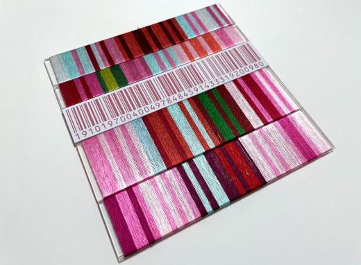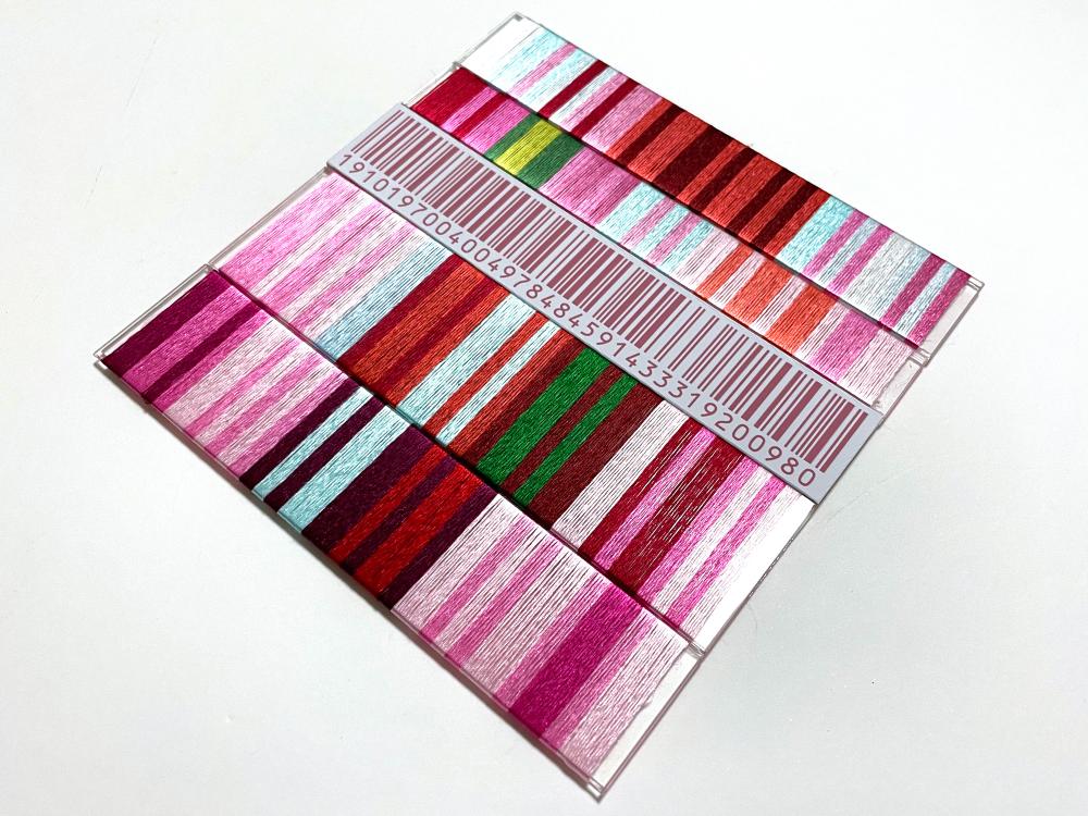 細く切ったアクリル板に刺繍糸を巻きつけたものをアクリル板に貼り合わせたもの