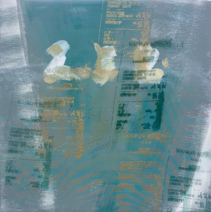 本シリーズ[Second skin/ セカンドスキン] はレシートをコピーし、コピーしたものを再度コピーする行為を重ね、イメージが崩れた図像をシルクスクリーンで施した作品です。