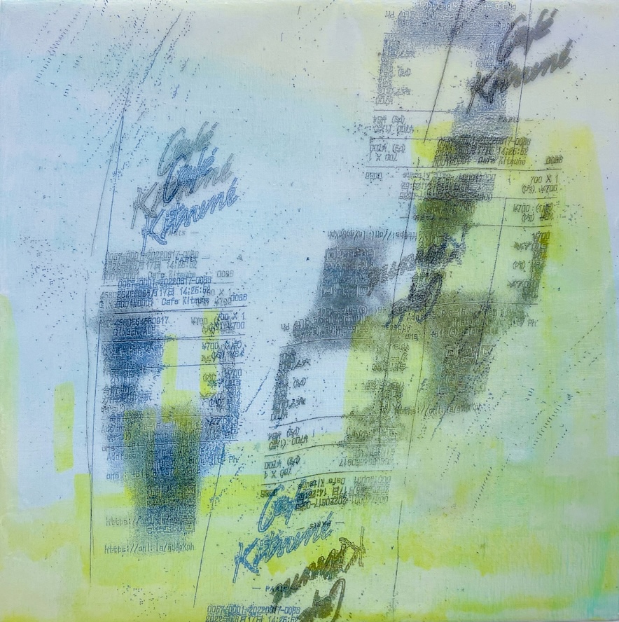 本シリーズ[Second skin/ セカンドスキン] はレシートをコピーし、コピーしたものを再度コピーする行為を重ね、イメージが崩れた図像をシルクスクリーンで施した作品です。
