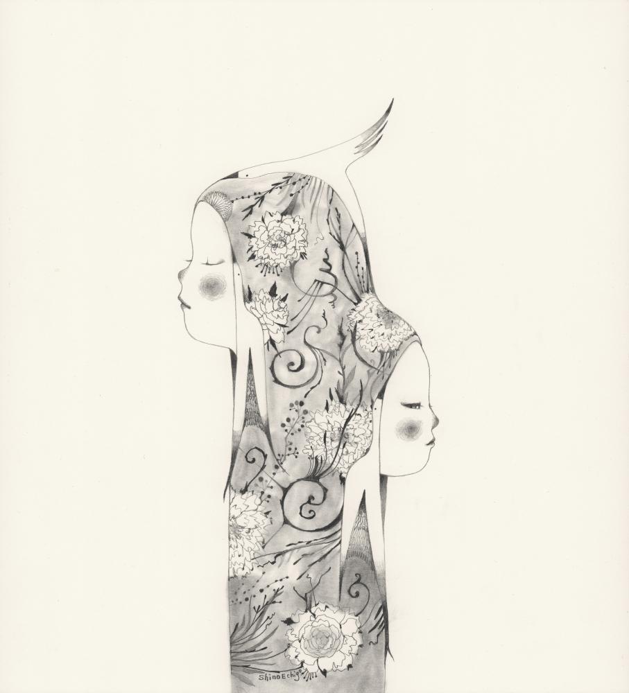 越後しの氏が一貫して追い続けているのは、その時々の自分の心象風景だといいます。念写のようにして日々、彼女の手元から生まれるユニークな「自画像」には、原画か版画かを問わず、詩的な含意の膨らみと民芸品的な可愛らしさがあります。 本作は、彼女の個展でも常に絶大な人気を誇る鉛筆画シリーズ近作より、越後氏自薦の1枚です。細やかなタッチと階調豊かな濃淡により、彼女のアクリル画や紙版画の世界が、優しい鉛筆画として展開されています。本作は植物の「接ぎ木」を見てその擬人化を発想したことで仕上がった作品。