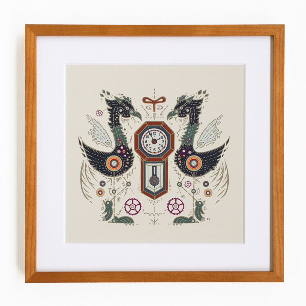 円相図のシリーズは時間と空間をテーマにした一連の作品。 中心に時計を置き、両脇に「阿・吽」の一対の獣を置くシンメトリの配置は神社の狛犬から着想を得ました。