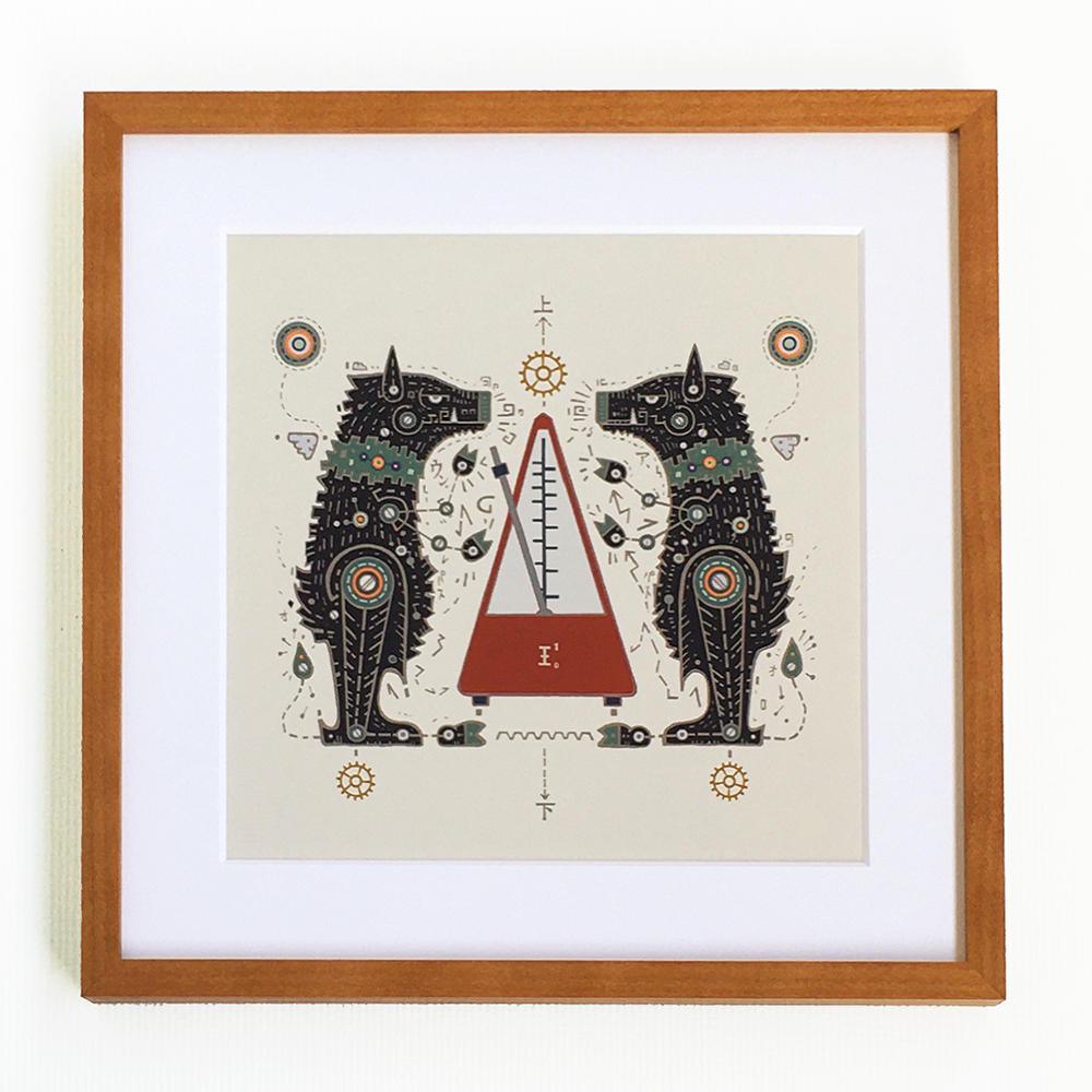 円相図のシリーズは時間と空間をテーマにした一連の作品。 中心に時計を置き、両脇に「阿・吽」の一対の獣を置くシンメトリの配置は神社の狛犬から着想を得ました。