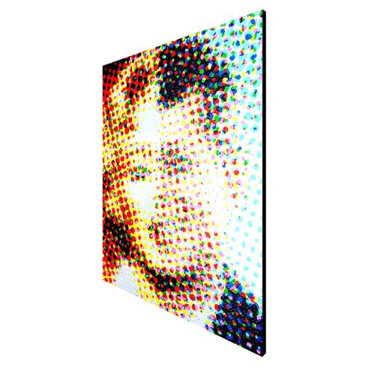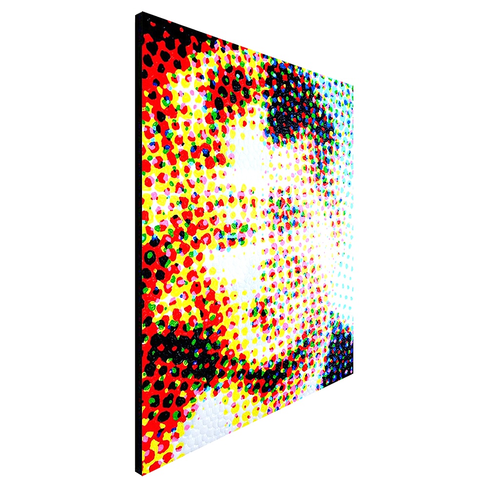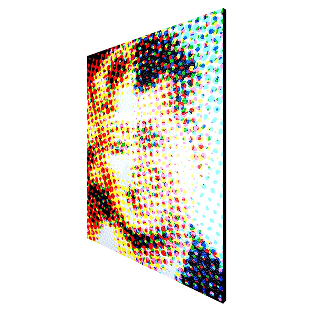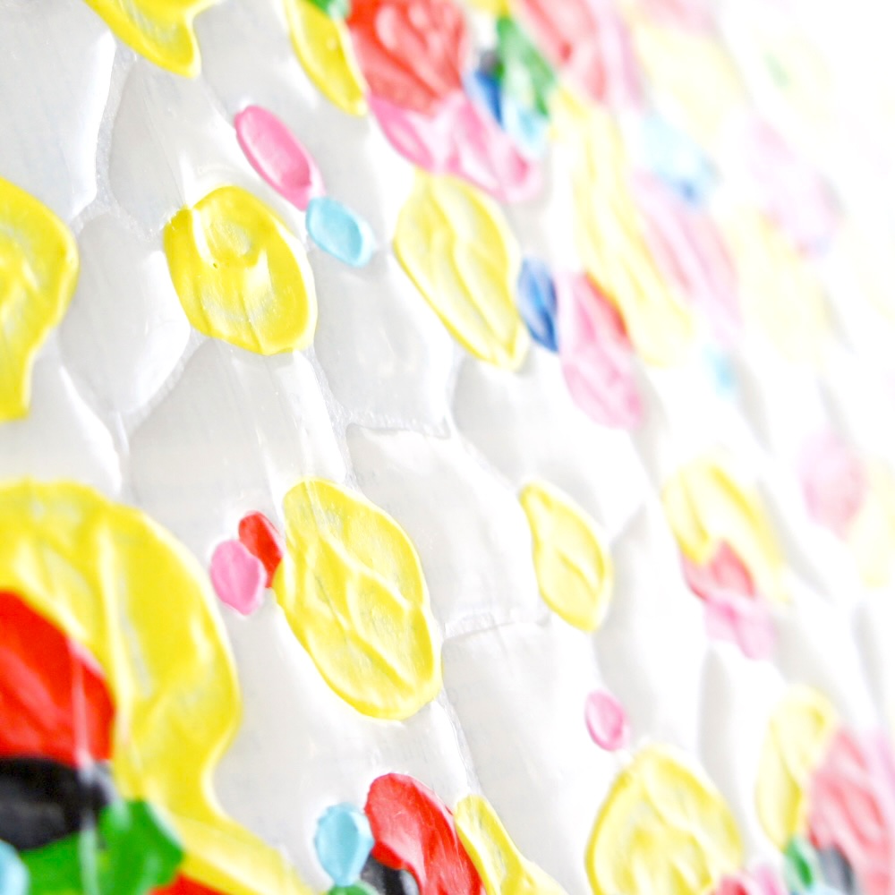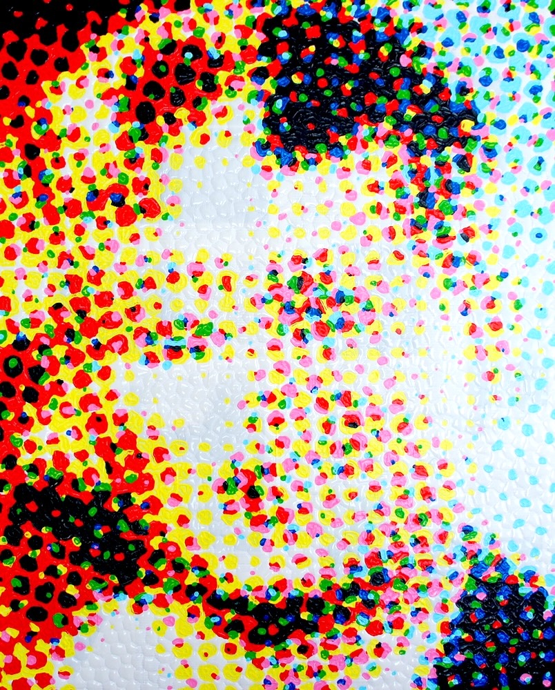 This is not a coincidence. At first, I digitally disassemble the colors of what I draw. Then, I paint every dot of the colors by hand. It would be the gimmick that makes the clusters of irregular colors look like a blurred illusion.