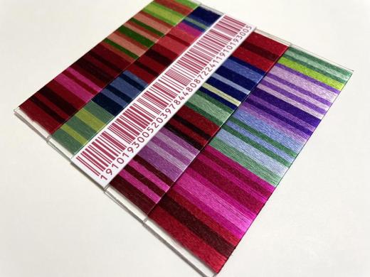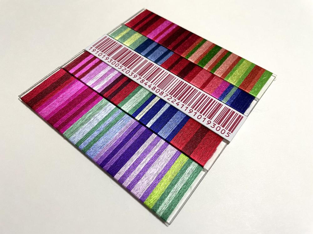 細く切ったアクリル板に刺繍糸を巻きつけたものをアクリル板に貼り合わせたもの