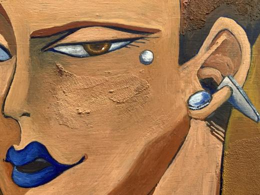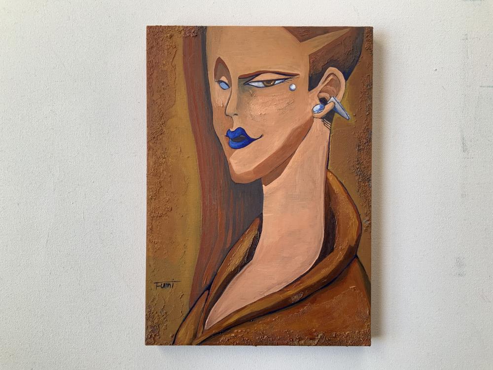 Sassy women シリーズ第4弾。画家モディリアーニの恋人ジャンヌ・エビュテルヌは自身も画家を志していたと言います。内気だったとも伝えられるジャンヌですが、彼女が描いたグワッシュの自画像ではジャンヌは鋭い視線を持った意志の強い女性だという印象を受けます。今作品では、もしジャンヌが今の時代に生まれていたらどのように生きていたのだろうか、と想像しながら制作しました。