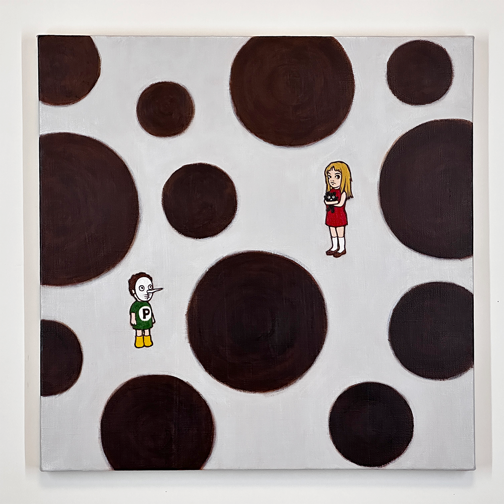 アンタカンタは、90年代に現代美術のアーティストとして活動していましたが、まったく食べていけなくなってしまい、どん底から起業しました。会社を成長させていく中で経験した 思考が現実になっていく世界。その世界を作品のテーマとして、2015年からアート活動を再開しました。モチーフとして登場する4.5頭身の女の子は、マリアカンナと言う名前で、教科書の隅に描き続けてきた空想上のモデルです。幼く小さく弱いマリアカンナとポポが、固定概念を振り払い、思考が現実になる世界を旅する姿を絵画作品にしています。
