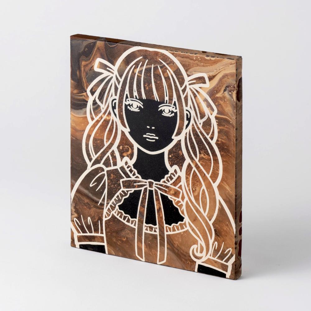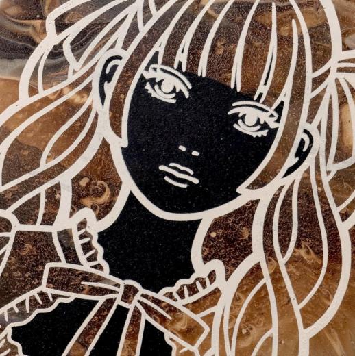 一見デジタルに見える描線、ポップな存在感のモチーフと普遍的な構図。そこにミックスされる心地よい闇のニュアンス。それを緻密な塗りの技術でグラフィカルに表現してみせる新進気鋭による一作です。グループ展「HAUS」(2023年、北品川・gallery 201)で展示され好評を博しました。