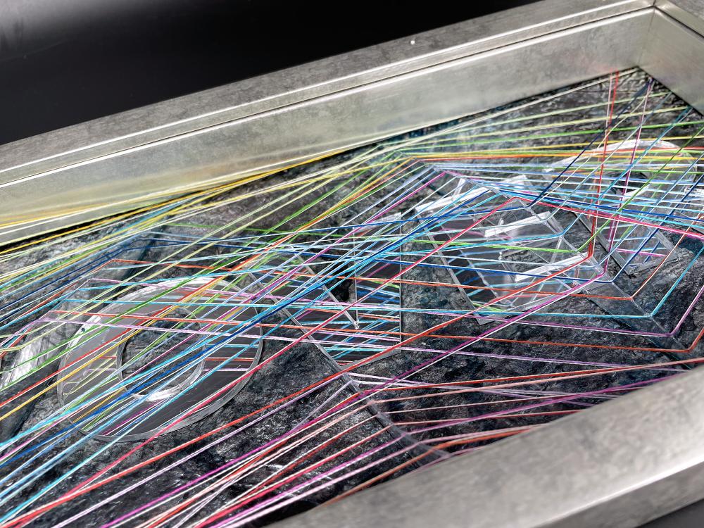 Mixed media (acrylic paint, embroidery thread (silk), acrylic board, wood board)