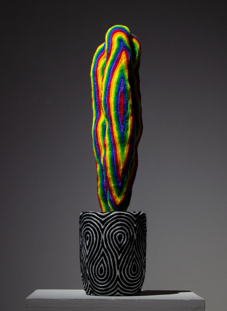 ”Prism-Implant”シリーズは室内に存在している自然、主に観葉植物をモチーフに制作した。 鉢とは切り取られた大地であり、それにより土や植物が室内に存在している。 屋外と屋内を区切った上で、室内に逆輸入された自然。それらはある種の違和感として自然界と人界の境界を曖昧なものにする、つまり内と外を繋ぐ役割を果たしているのではないだろうか。 生活空間の中に、一度は自ら取り除いた「自然」を再び取り入れる。それはきっとそれが生きることに必要であるからだ。 これは一見、人が意図的に行なっていることのようだが、私はこれも自然が循環するエネルギーの一環なのではないかと感じる。