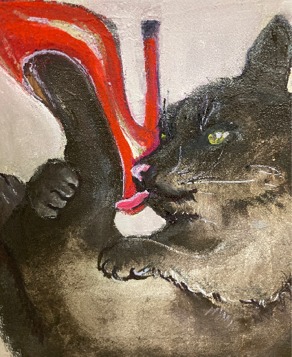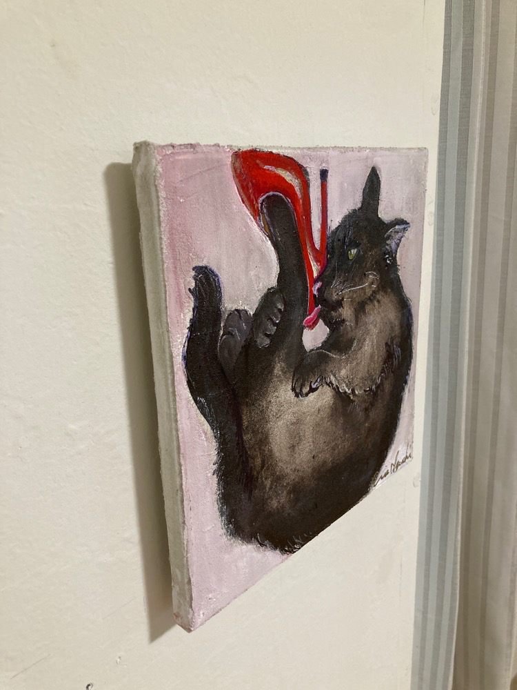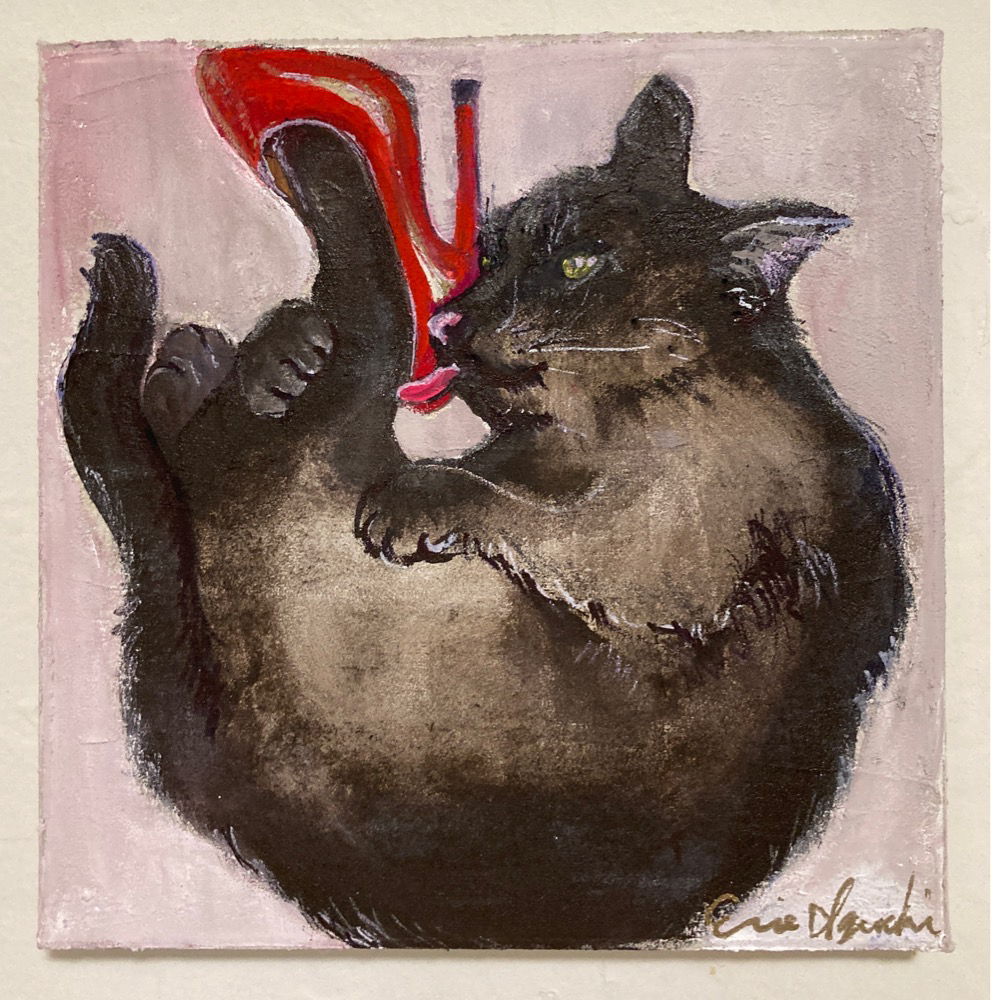 長靴を履いた猫からインスパイアされたハイヒールを履いた猫です。 虎の威を借る狐のように人間の威を借りたネコの様を表現しつつ、猫の気まぐれでいつか気が変わってしまいそうな本能的な部分も表現しています。 アクリルガッシュによるアクリル画です。