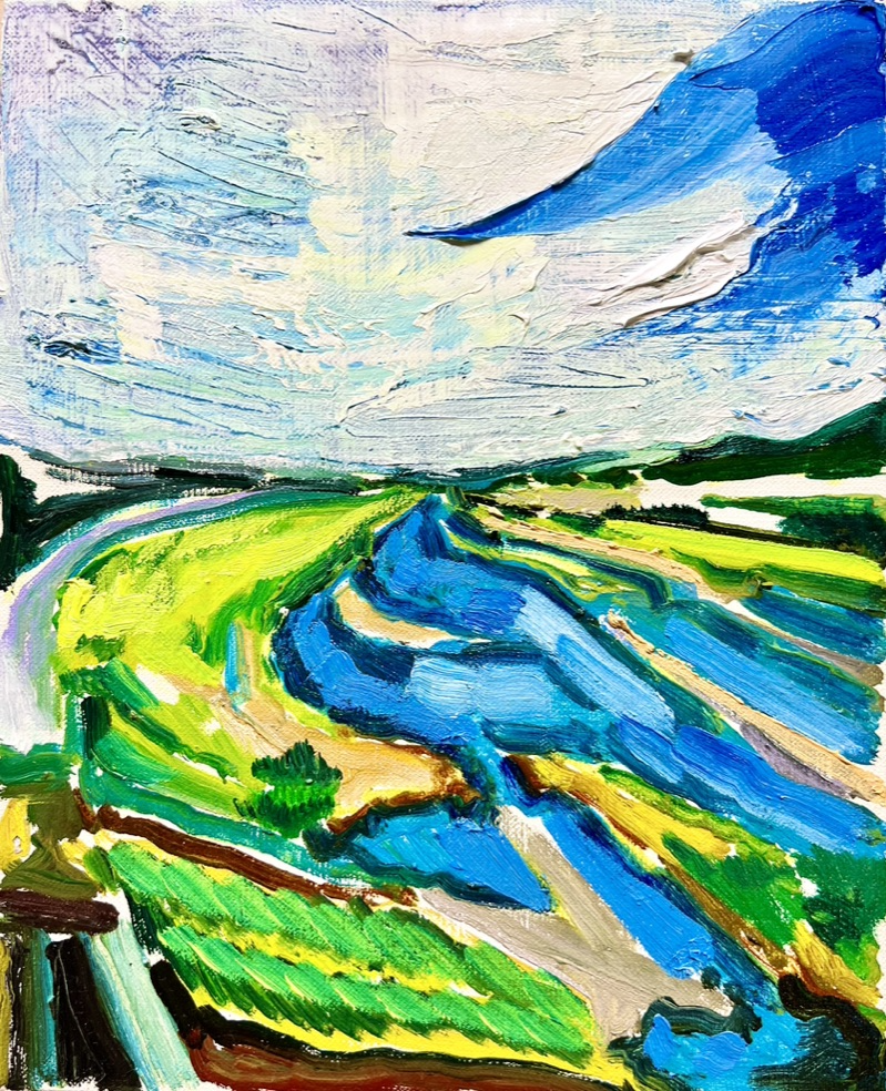 作品のモチーフは、実際に自分の目で見た風景を収めた写真たちから選びます。描きたいと思う風景を描きたいように描く。そうやって1枚の絵が完成した時私の内に生まれるものは、疲労感と充足感、そして何よりも、もっと絵を描きたいという欲求です。私を制作へと突き動かすのは、この直感と欲求なのです。