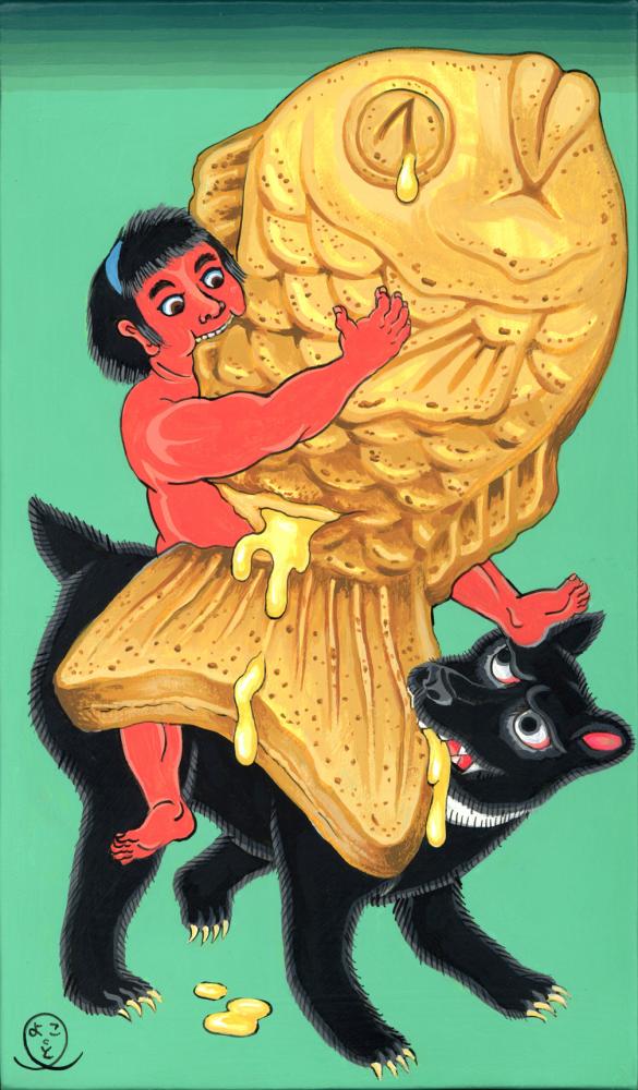 鯉をたい焼きに見立て、食べ盛りの金太郎達と熊が取り合う様子を描いた国芳の浮世絵「坂田怪童丸」のパロディ作品の続編です。 ※裏面に吊り下げ用の金具と紐が付いています。