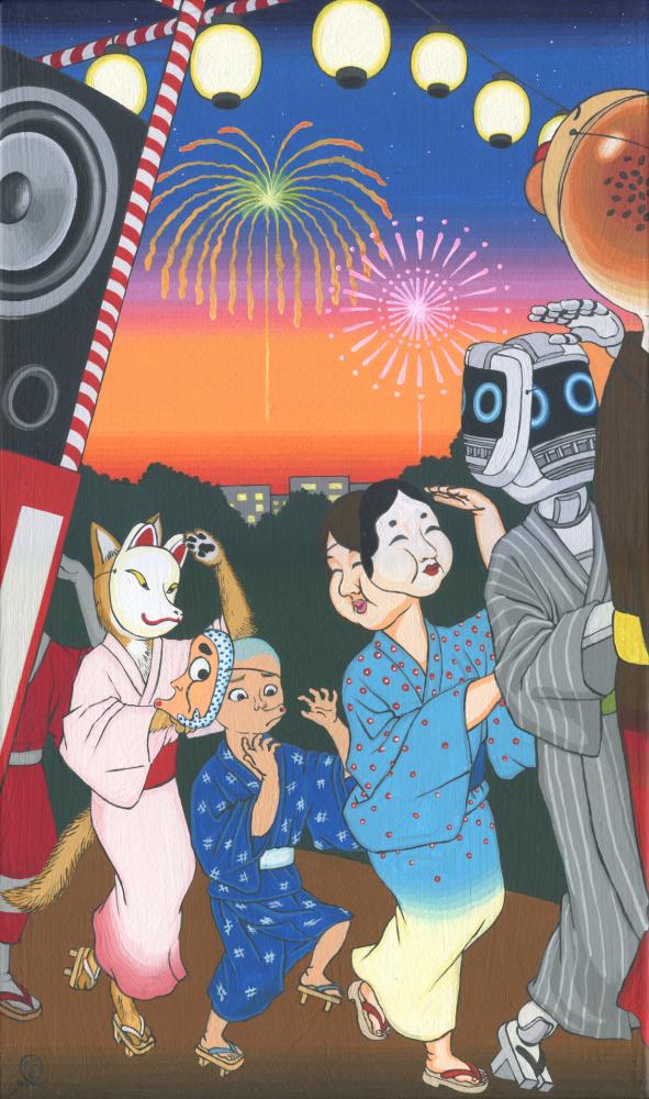 踊っている間に、着けたお面の姿に体ごと変身してしまった、不思議な場面を描いた作品です。 ※裏面に吊り下げ用の金具と紐が付いています。