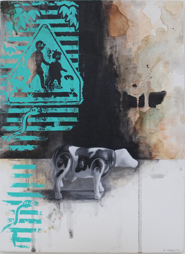 牛の雑貨とチルチルミチルのようなイラストを組み合わせて描きました