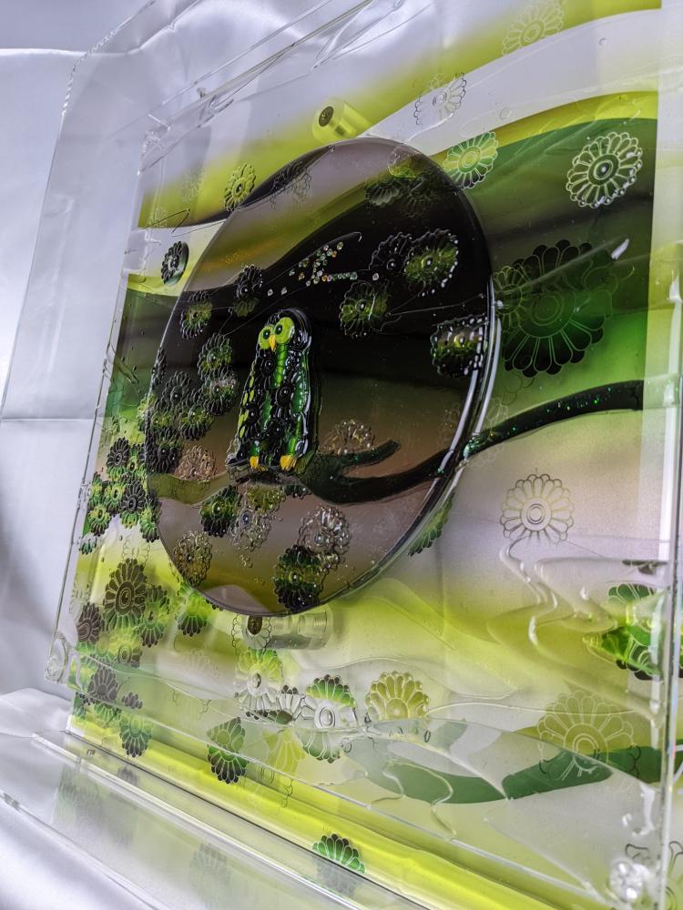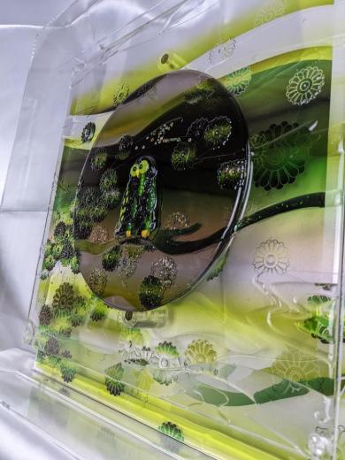 月乃カエルの作品は、透明樹脂を中心として、様々な素材で構成されたミクストメディア作品です。
