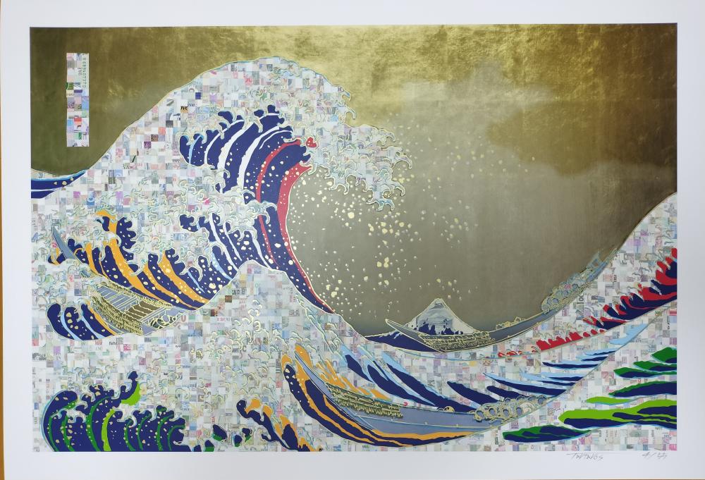 同構図でカラーバージョンが多数作られる浮世絵の引用と、紙幣がランダムにコラージュされたAutomaticPaintingにより全てユニークピース。