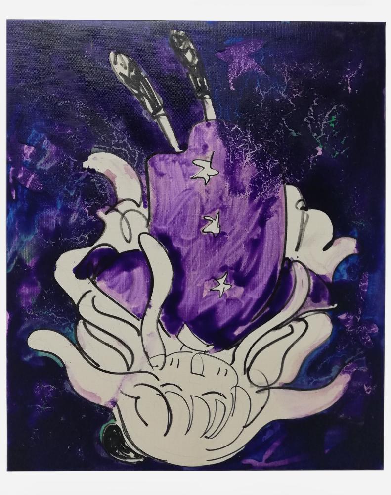 私の場合、表現は、リアリティを感じられる二次元から始めるしかない。私は普段pcやノートに、SNSにあげるために生みだしたような物語のないキャラクターを落書きするが、キャラクターは自分自身では自立できないほど弱々しく、私に少し似ているようにも思う。私は線体であるその子を絵画の中で、ただの線に還るように解きほぐし解放することを試みる。雑多な要素をほぐし、真に本質的なものを探るなかで、現実のリアリティを少しでも感じたいと思っている。