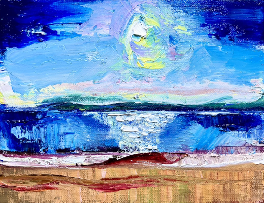 作品のモチーフは、実際に自分の目で見た風景を収めた写真たちから選びます。描きたいと思う風景を描きたいように描く。そうやって1枚の絵が完成した時私の内に生まれるものは、疲労感と充足感、そして何よりも、もっと絵を描きたいという欲求です。私を制作へと突き動かすのは、この直感と欲求なのです。