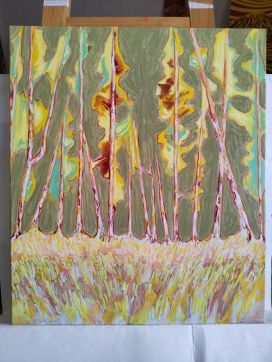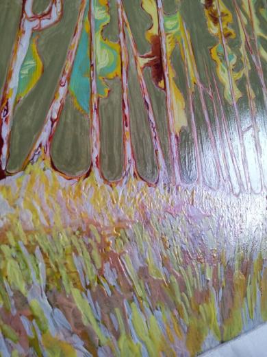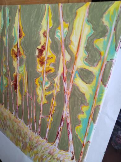 真夏の日差しを受けて、輝く表層だけを見せる森。そこには永遠に夜が来ないかのように感じた。 スタンドオイルの多用で表層の光を表現してもおりますが、そのぶん通常の油彩作品よりも反射いたします。