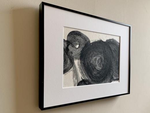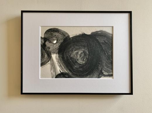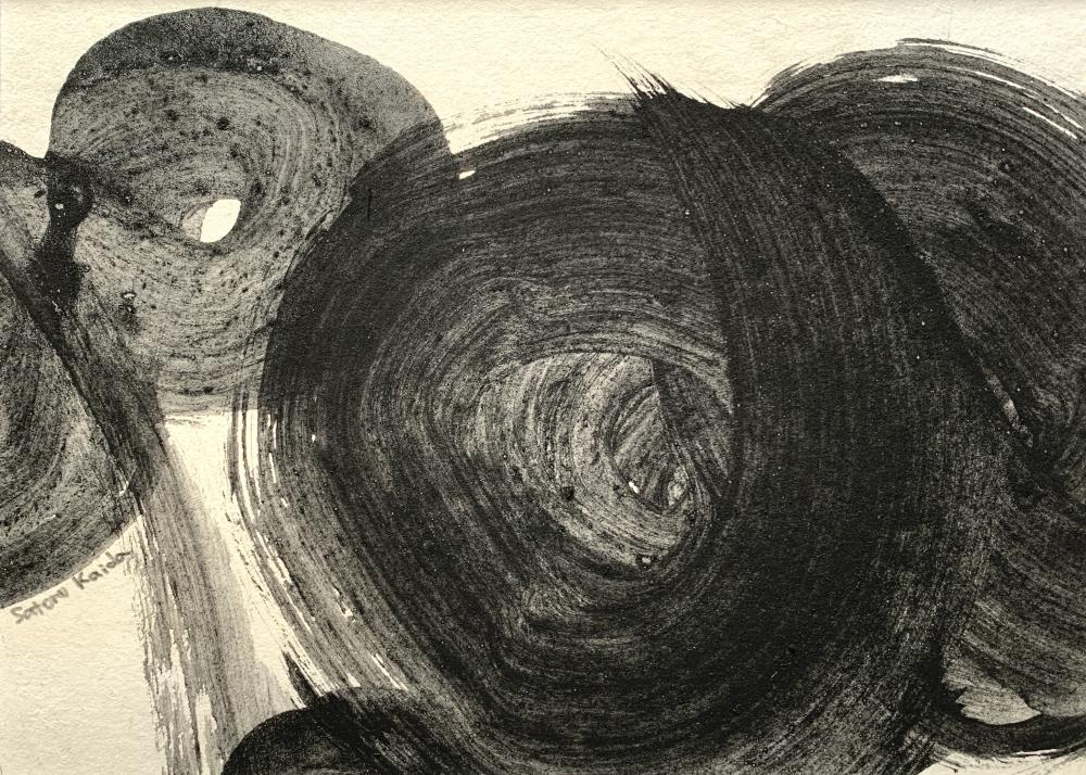 本作は、心(ハート)を描く彼女の「INFINITY」シリーズからの派生で生まれた一作。ハートを延々と描き続けるなかで筆から官能的な動態が生まれ、その一瞬を封印するスリリングな面白さがあります。大きな和紙に描いたものをトリミングし裏打ちして制作しています。