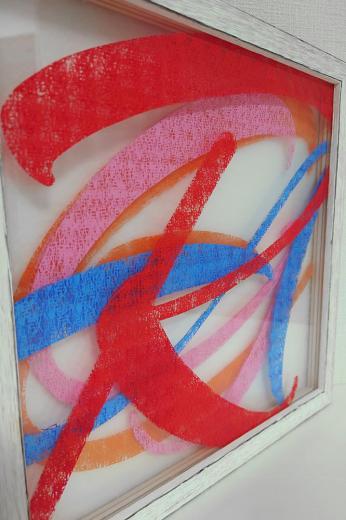 ・1つの漢字を集合させて、その漢字の意味をもつ他の言葉(例:愛→LOVE、望→HOPE)にしたものを、複数枚のアクリルの板にプリントした作品。