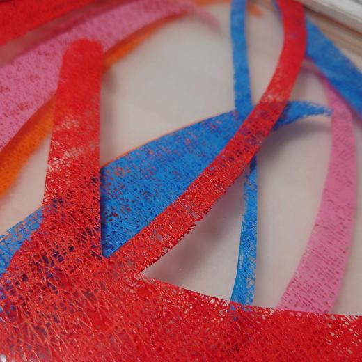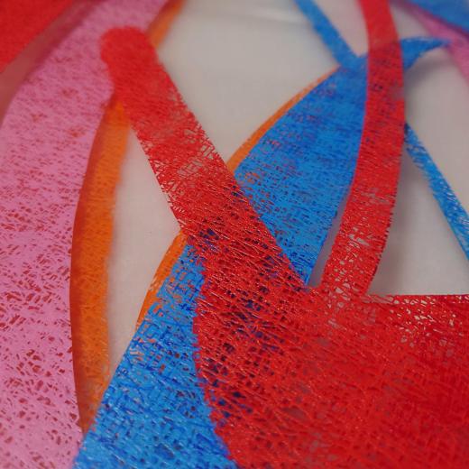 シルクスクリーンで手刷りしたアクリル板を重ねる