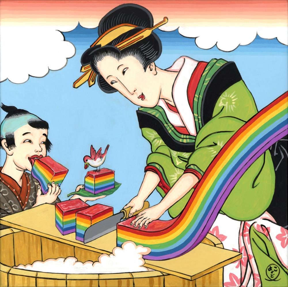 シンガポールの層状に重なったカラフルなお菓子を虹に見立てた、渓斎英泉の浮世絵「蚕養草たけ子」のパロディ作品です。 ※裏面に吊り下げ用の金具と紐が付いています。