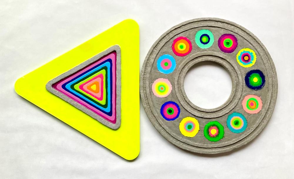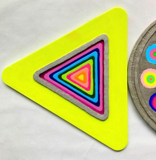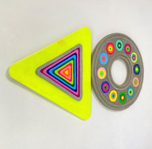 リズミカルに配置した丸い穴を開けそこに着色した樹脂を流しこんでいます。