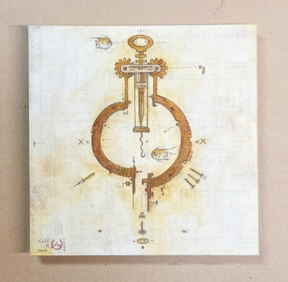 下地の模様はデジタル写真を元に加工して作り水彩紙に出力。アクリル、顔彩、水彩色鉛筆、顔料インクの塗り重ねによる異なる質感のテクスチャの重なり合う効果(交差)を狙いました。