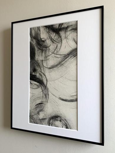 書道の美と技法を現代アートのなかへ新鮮な角度で吹き込む活動をしている、開田氏。墨汁と紙が引き起こす偶然性を援用しながら自らのイマジネーションを、作為と無作為のフュージョンという創造に結びつける、そんなゾクゾクする新しい「書」の魅力を盛んに発信しており、これまで「書」のジャンルに馴染みのなかった人々からも注目を集めています。 本作では、動作を繰り返す中で構築されていく線から強調するべき線を鉛筆で加筆しています。