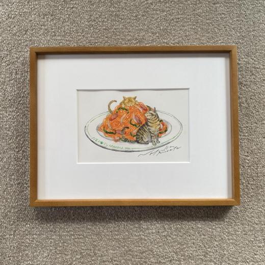 本作は、猫ミックスでの食べ物シリーズの一作です。心温まる雰囲気と目を奪われるほどユニークな画想の組み合わせが人気。LOFTの人気ステーショナリー「NEKO TO MANMA」のために描かれた原画です。