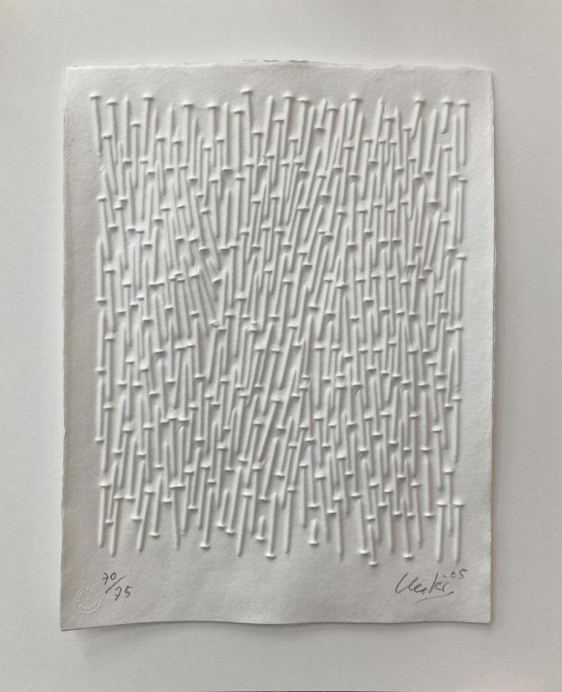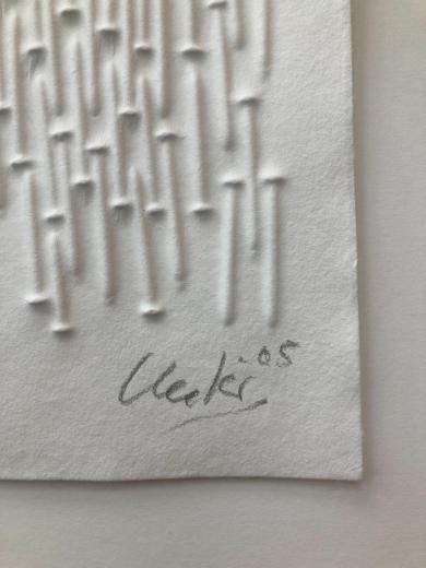 ギュンター・ユッカーはドイツの彫刻家でありオプアーティスト、インスタレーションアーティストです。無数の釘が配置された触覚的な彫刻的絵画やインスタレーション作品で知られています。彼は前衛美術運動、グループ・ゼロの一員としても知られています。仏教や道教、イスラム教など東洋哲学に関心を持っていたユッカーは、ハンマーで繰り返し釘を打つことを 瞑想的な儀式として用い その理論を生きた芸術的実践に変えたのです。彼は釘のほか、モノクロの塗料、砂や灰、石、ガラス、布や木 その他様々な素材を用いて、秩序と混沌の詩的な精神を吹き込んだ作品を作り続けています。
