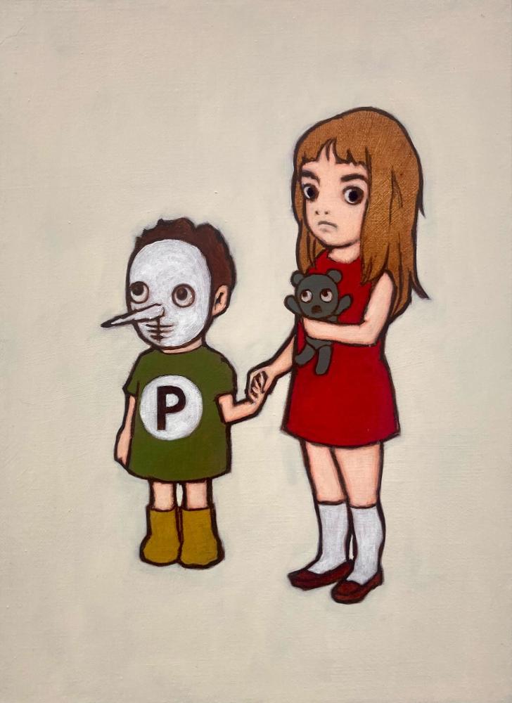 アンタカンタは、90年代に現代美術のアーティストとして活動していましたが、まったく食べていけなくなってしまい、どん底から起業しました。会社を成長させていく中で経験した 思考が現実になっていく世界。その世界を作品のテーマとして、2015年からアート活動を再開しました。モチーフとして登場する4.5頭身の女の子は、マリアカンナと言う名前で、教科書の隅に描き続けてきた空想上のモデルです。幼く小さく弱いマリアカンナとポポが、固定概念を振り払い、思考が現実になる世界を旅する姿を絵画作品にしています。