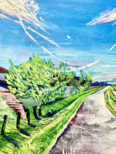 作品のモチーフは、実際に自分の目で見た風景を収めた写真たちから選びます。描きたいと思う風景を描きたいように描く。そうやって1枚の絵が完成した時私の内に生まれるものは、疲労感と充足感、そして何よりも、もっと絵を描きたいという欲求です。私を制作へと突き動かすのは、この直感と欲求なのです。
