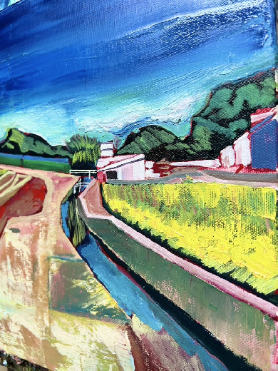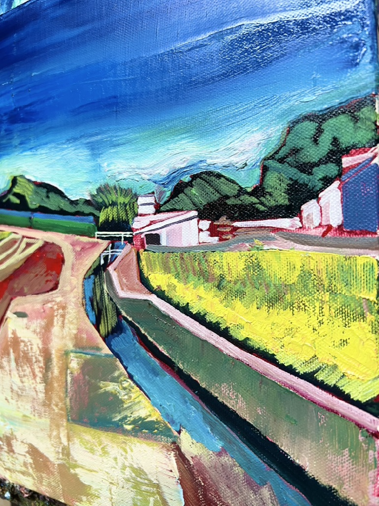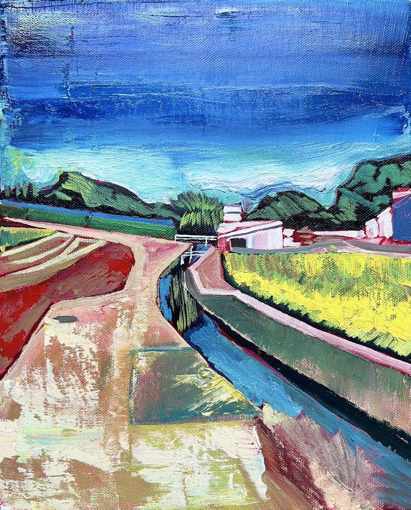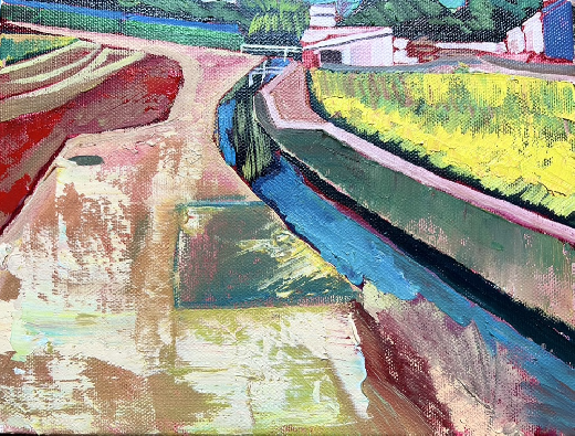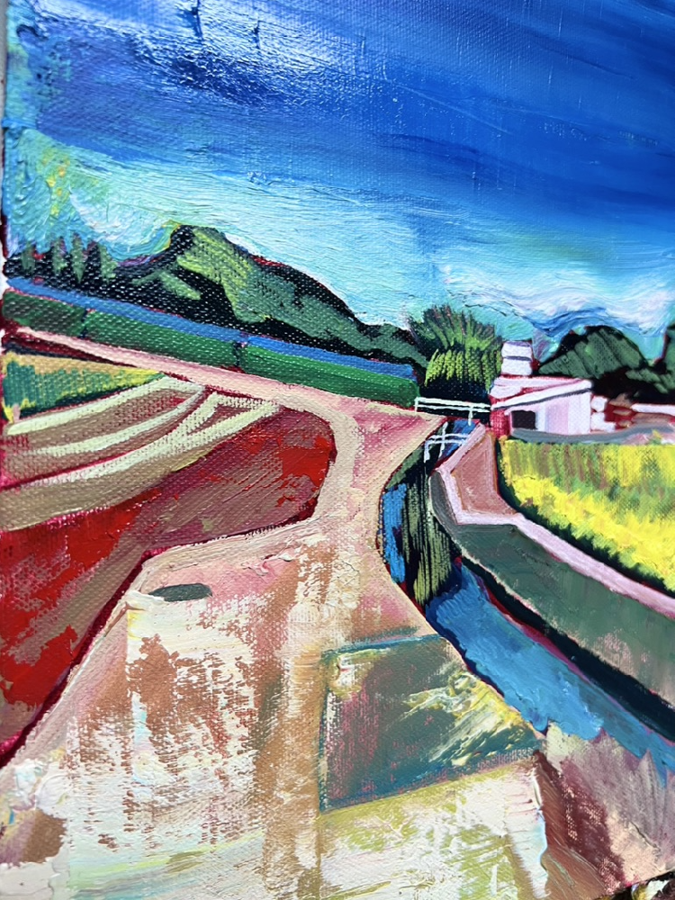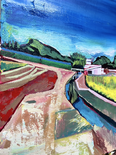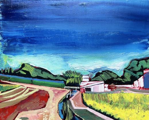 作品のモチーフは、実際に自分の目で見た風景を収めた写真たちから選びます。描きたいと思う風景を描きたいように描く。そうやって1枚の絵が完成した時私の内に生まれるものは、疲労感と充足感、そして何よりも、もっと絵を描きたいという欲求です。私を制作へと突き動かすのは、この直感と欲求なのです。
