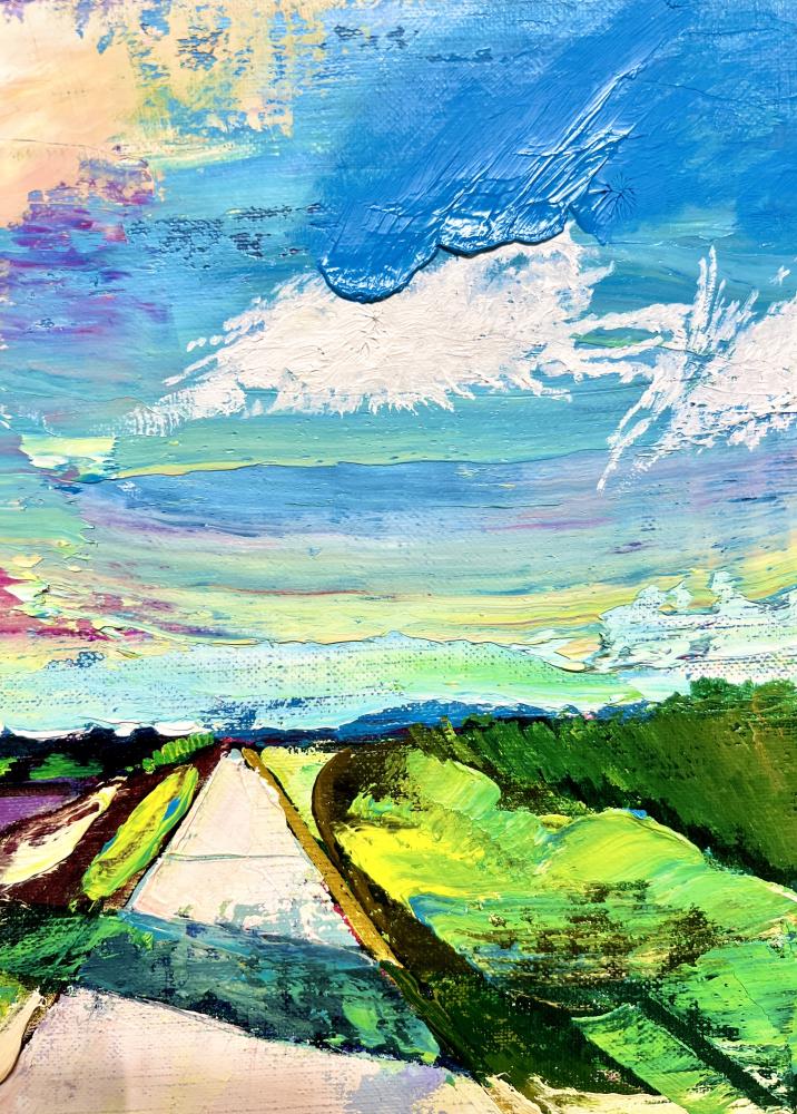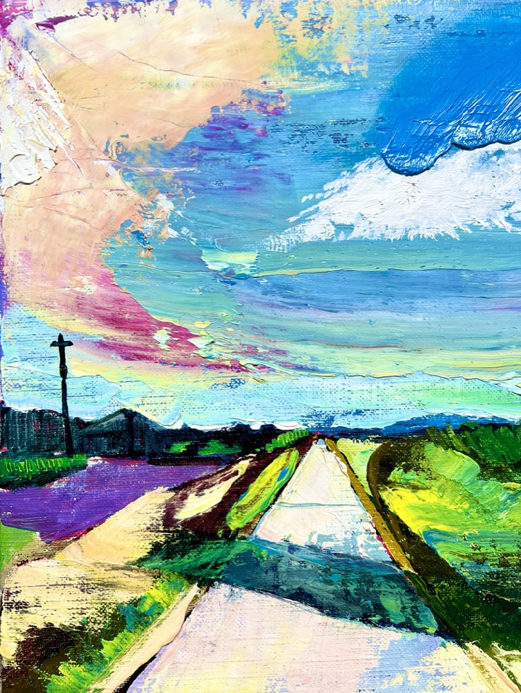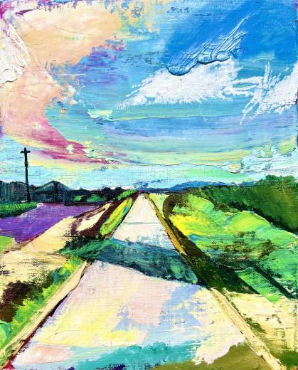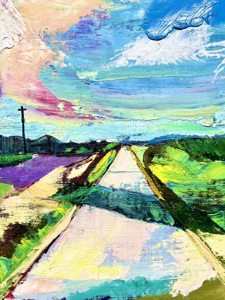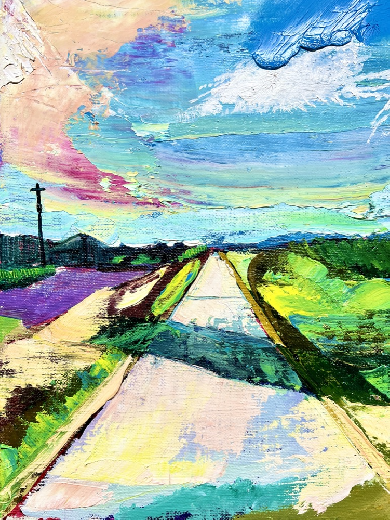 作品のモチーフは、実際に自分の目で見た風景を収めた写真たちから選びます。描きたいと思う風景を描きたいように描く。そうやって1枚の絵が完成した時私の内に生まれるものは、疲労感と充足感、そして何よりも、もっと絵を描きたいという欲求です。私を制作へと突き動かすのは、この直感と欲求なのです。