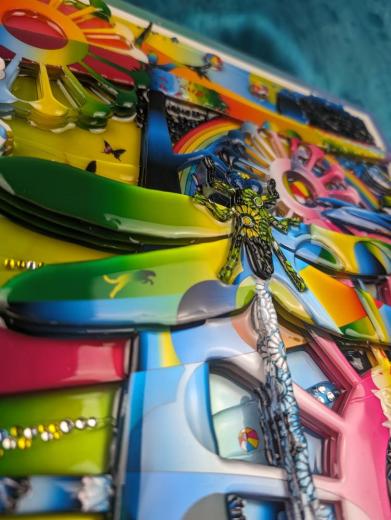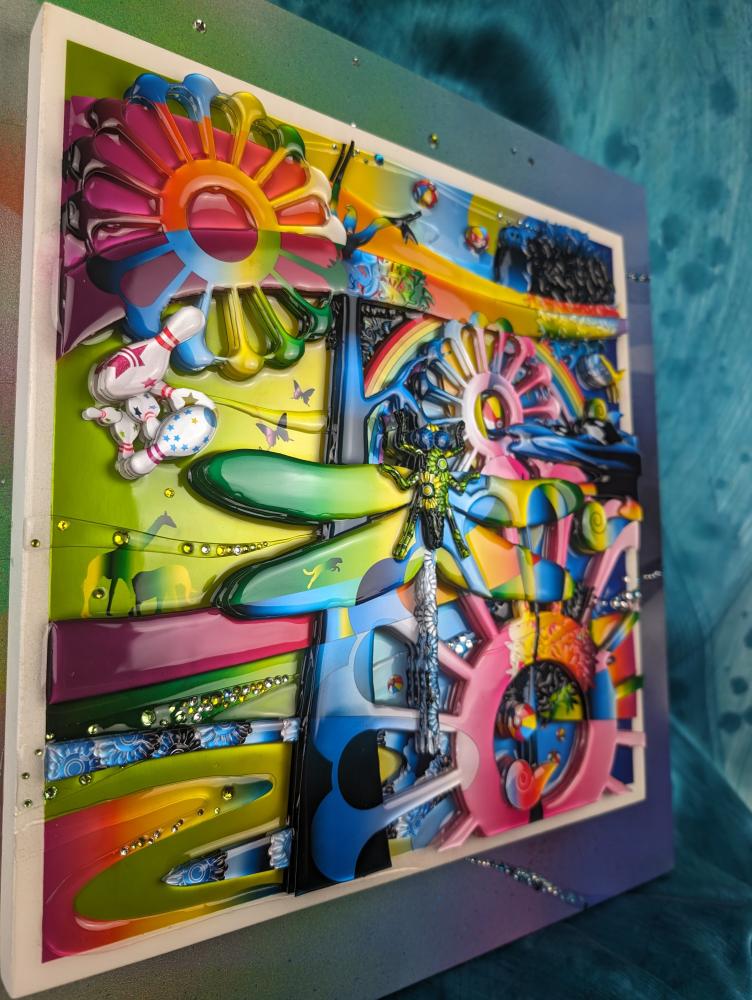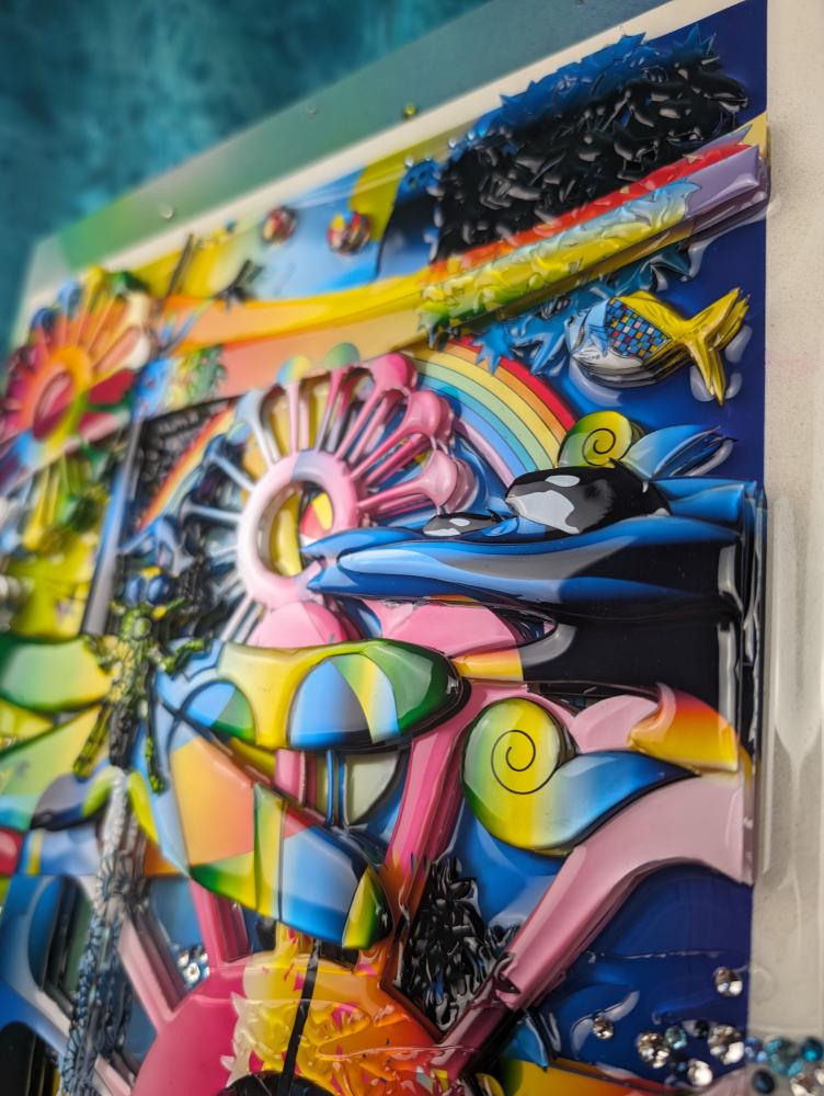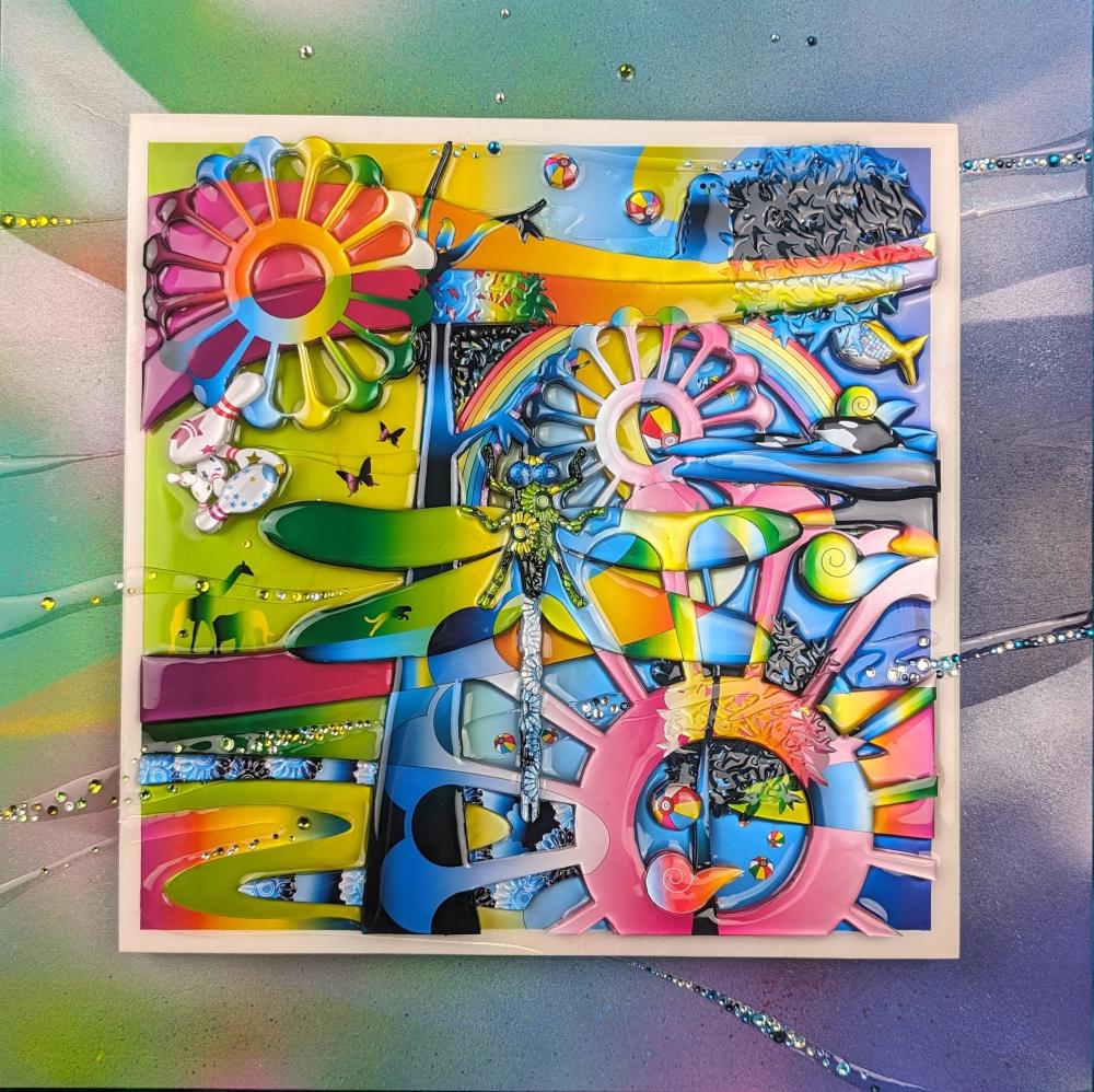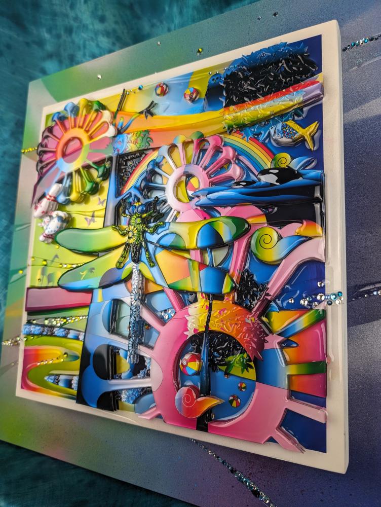 3D artworks produced by KAERU TSUKINO are born from the combination of various materials such as metal, using his original digital illustration as blueprint. Then they are layerd in coating acrylic transparent resin and finished with glitters and rhinestones.The appearance that different materials show their individual charm and create a unique world - it expresses the fusion of diversity and interculturalism in this world. Also, KAERU feels that the world we exist is composed of "invisible layers". This is the one of significant reasons for making multi-layerd works using transparent resin.The "invisible layers" is the fluctuation of various consciousness and emotions of living creatures that are silently piled up in the world regardless of awareness. We are living on the earth made of such unstable and invisible emotions. In a land dominated by thin emotions, people's souls are exhausted.