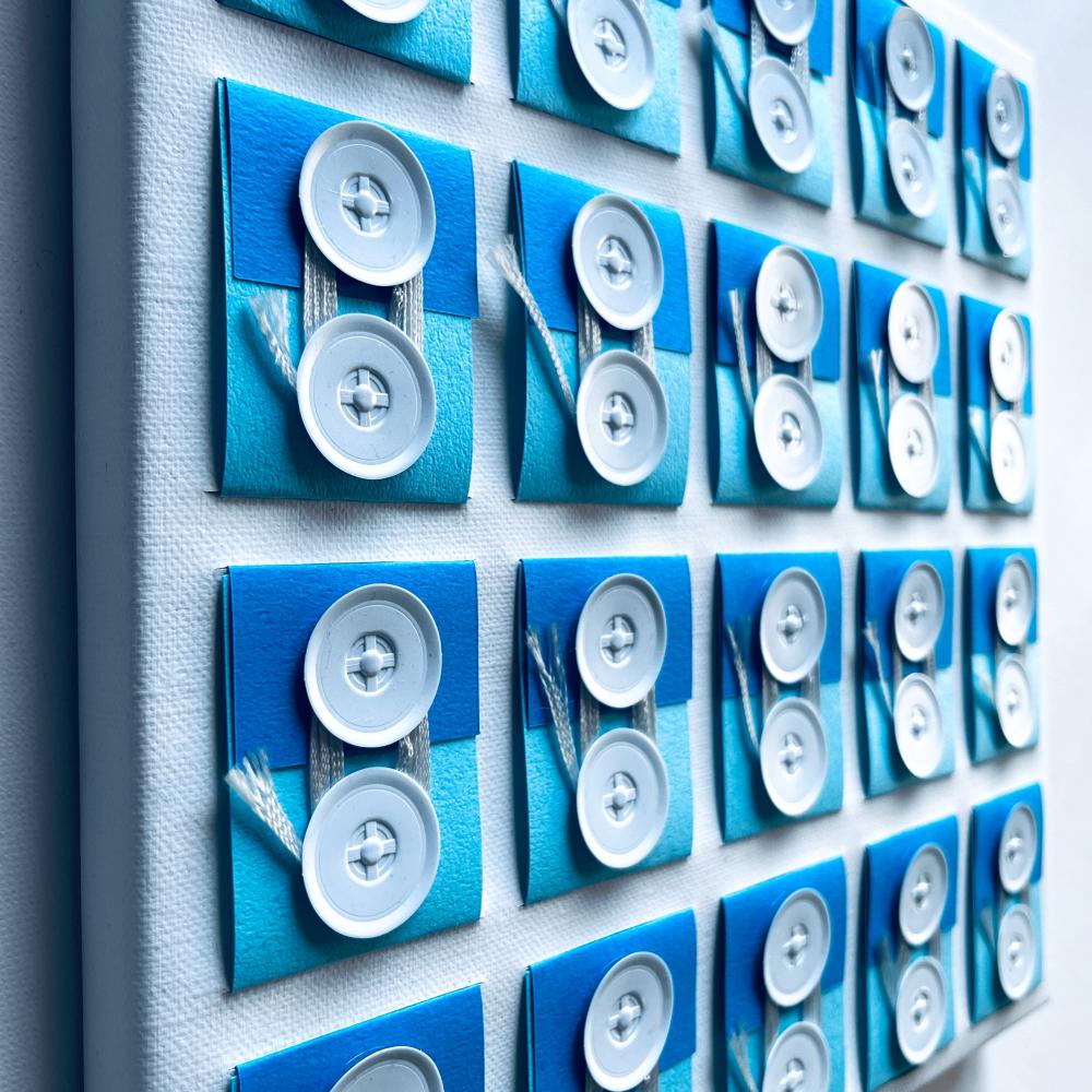 パネルに貼ったキャンパス生地に切れ込みを入れ、色画用紙をキャンバス生地の裏側から表側に通し、封筒綴じで留めています。