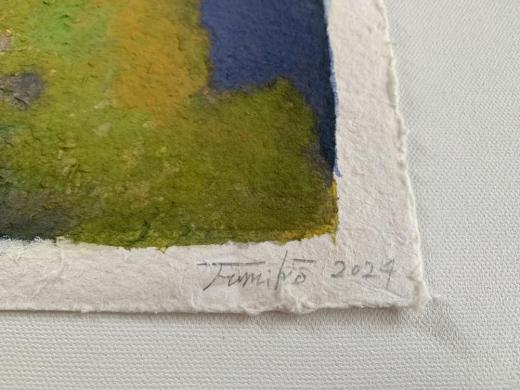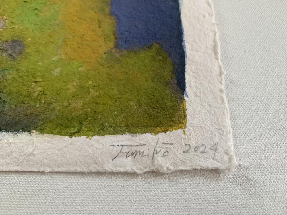 南インドの職人による100%コットンの高級水彩用紙を使用しています。紙は250gsmのしっかりとした厚さで、アシッドフリーなので作品の劣化、変色を極限に抑えてくれる支持体です。また、材料のコットンは100%リサイクルされたものを使用しているため、環境にも優しい素材となっています。手漉き紙の持つオーガニックなテクスチャーを最大限に活かした作品です。市販の額に合わせやすいA3サイズとなっていますので、お部屋に合った額をお選びください。