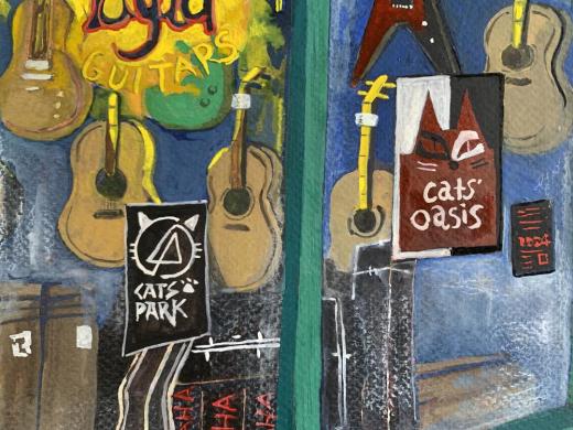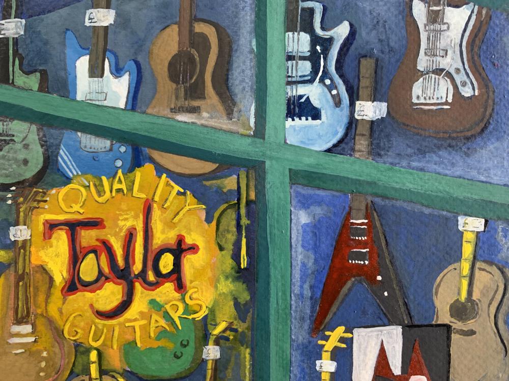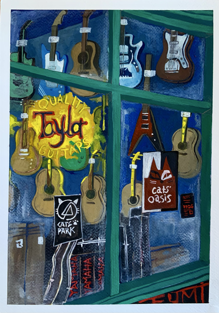ウェールズの首都Cardiffはアーケード(屋根付き商店街)がたくさんある街です。1番古い商店街は150年に建てられたものになります。この作品は迷路のように繋がったアーケードの中に見つけたギターショップにインスパイアされました。水彩用紙と絵の具は鮮やかな発色が特徴のWINSOR&NEWTON社を使用し、ガッシュ絵の具は耐久性の高い色のみを厳選して使用しています。作品は市販の額にも合わせやすいA4サイズです。