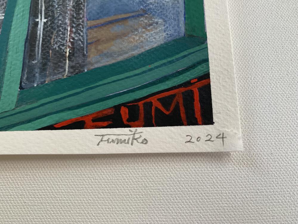 Fumiko was born in Japan but left her home country at the age of fifteen to pursue her interest in art. While studying in the UK, she backpacked around Europe where she learned about many masterpieces of art. This experience enabled her to experiment with a vast variety of painting techniques adapted from great artists, both past and present. After her graduation from the Camberwell College of Arts, Fumiko became an apprentice to Japanese-paper artisans for two years in Kyoto. While there, she developed her unique use of colours through the paper-dyeing practice. Since then, colour has been the most important element in her works. Through her international life, she has encountered a great diversity of cultures and people, and came to realise the complex emotions that lurk beneath them. This realisation quickly became the major theme of her works. In her imaginary landscapes and figures, she aims to depict both the beauty and ugliness of the contemporary world. Her cross-cultural background has been giving her artworks a distinctive style and she has been exhibiting her works internationally.