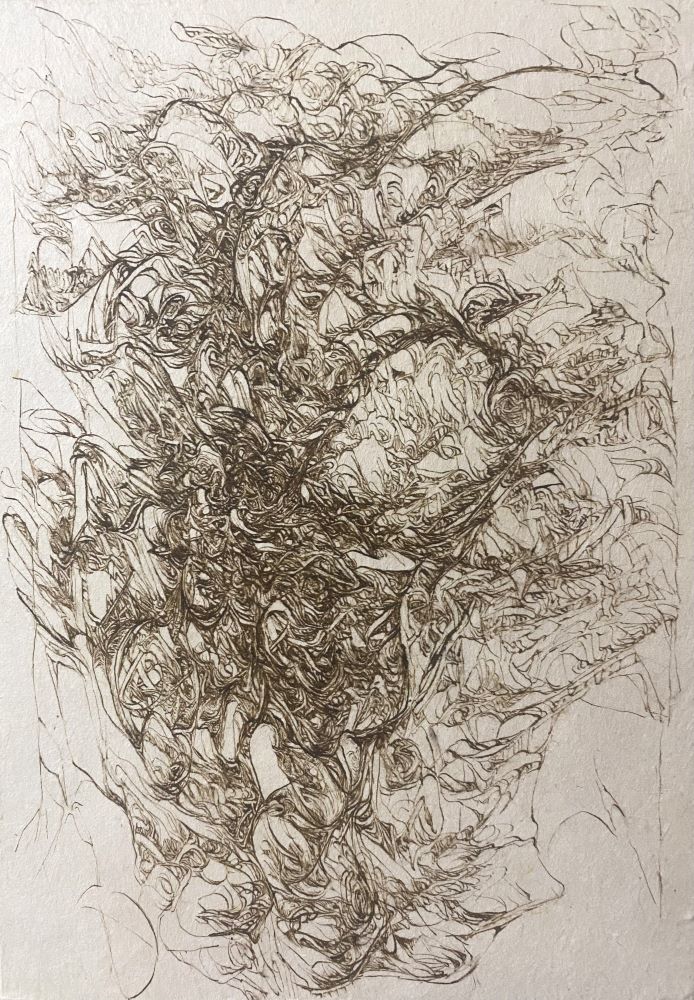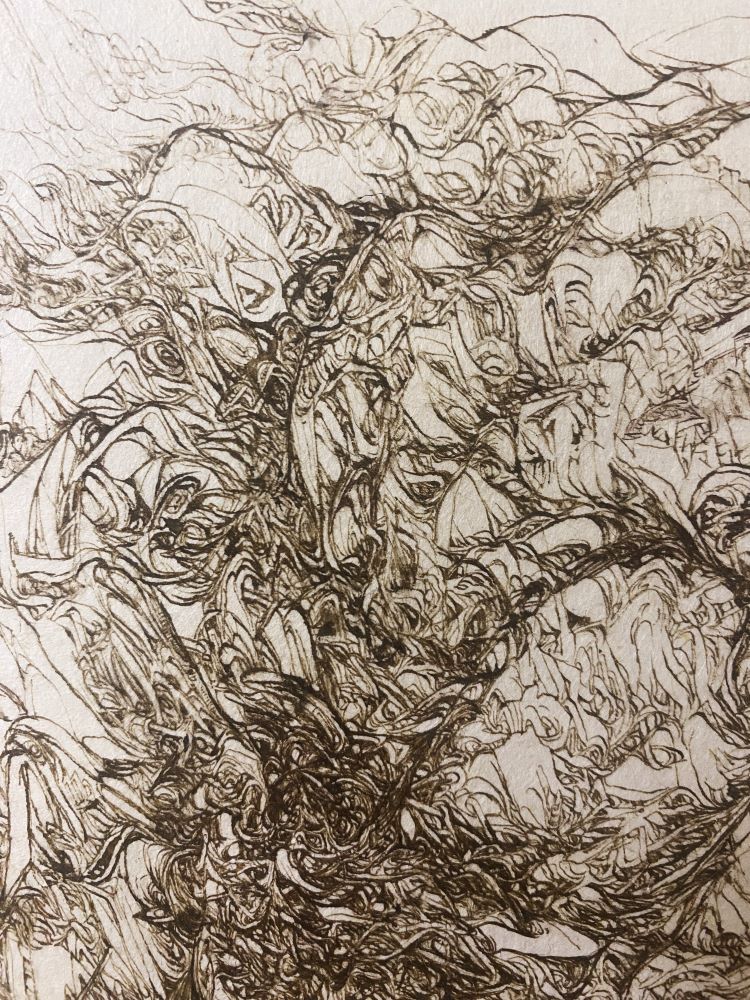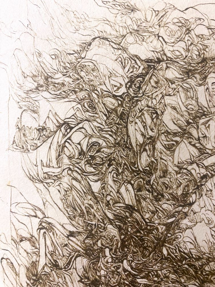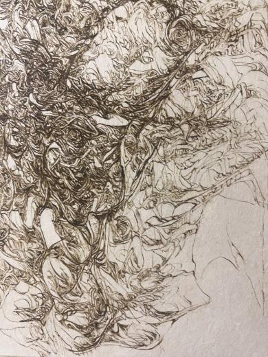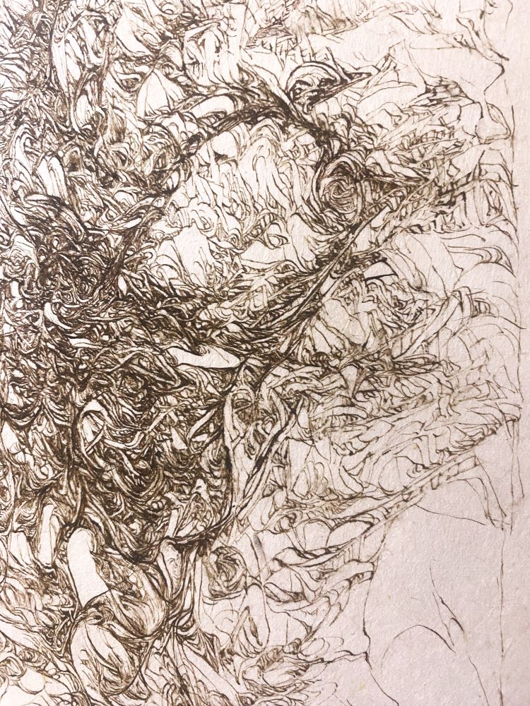 Each one of her lines, which are precise but sometimes boldly drawn, overlap numerous times and intersect, creating a wide range of tones and pulling us in to the deep world of the artwork.
