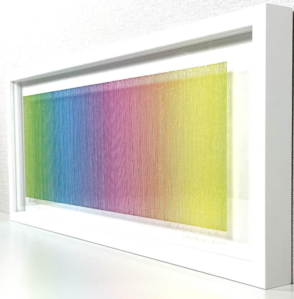 目の前にある空気、それはすべてを包み込み、あらゆるところに存在して、普段意識されることのない存在でもありますが、そんな空気の中の光をスペクトルに分解して取り出す、そんなイメージでこのWavelengthsシリーズの制作を始めました。 この作品は120色の色で構成されています。その120の色それぞれを尊重し、大切に思い、すべての色が全ての場所に来るように、120点の作品を作ろうと思います。