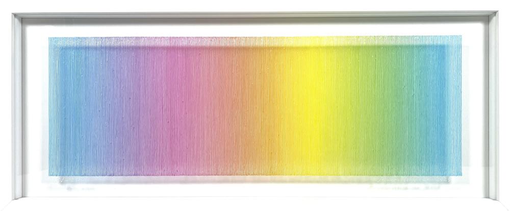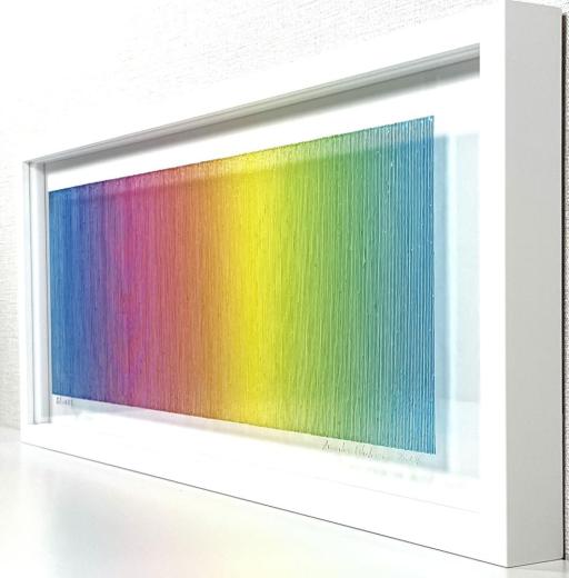 目の前にある空気、それはすべてを包み込み、あらゆるところに存在して、普段意識されることのない存在でもありますが、そんな空気の中の光をスペクトルに分解して取り出す、そんなイメージでこのWavelengthsシリーズの制作を始めました。 この作品は120色の色で構成されています。その120の色それぞれを尊重し、大切に思い、すべての色が全ての場所に来るように、120点の作品を作ろうと思います。