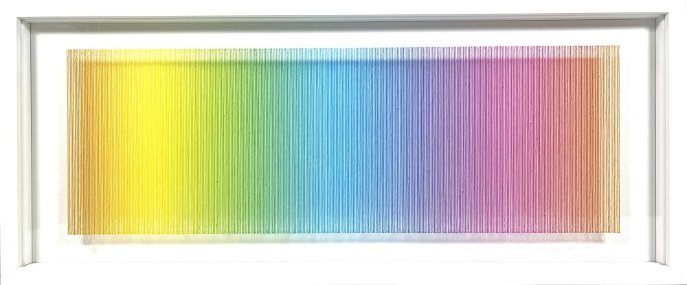 目の前にある空気、それはすべてを包み込み、あらゆるところに存在して、普段意識されることのない存在でもありますが、そんな空気の中の光をスペクトルに分解して取り出す、そんなイメージでこのWavelengthsシリーズの制作を始めました。 この作品は120色の色で構成されています。その120の色それぞれを尊重し、大切に思い、すべての色が全ての場所に来るように、120点の作品を作ろうと思います。