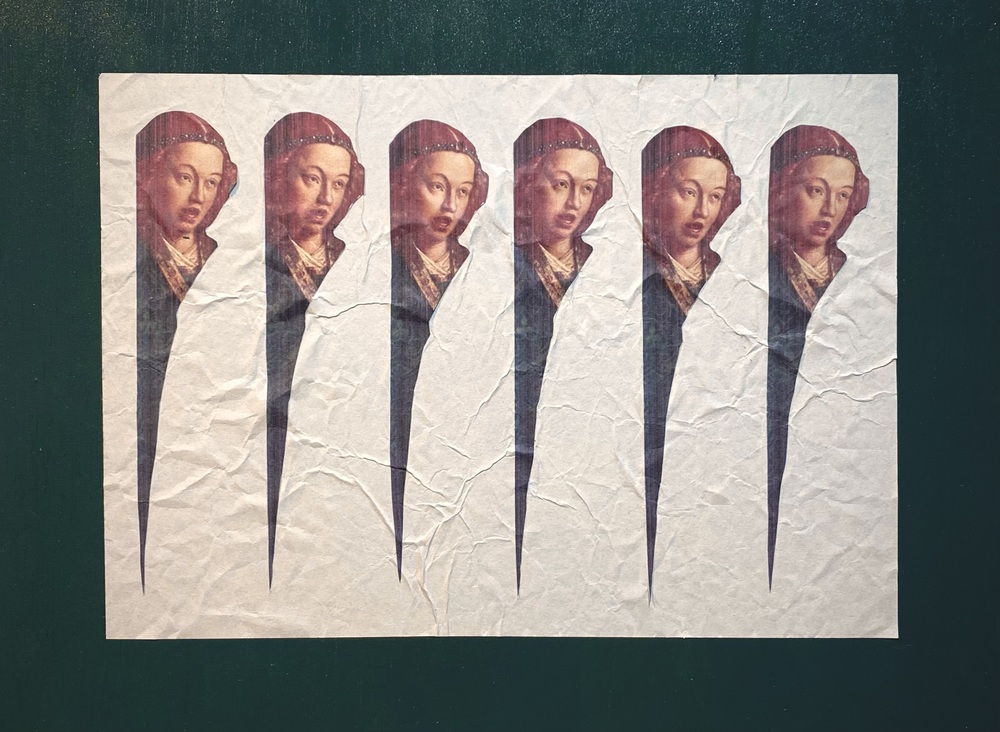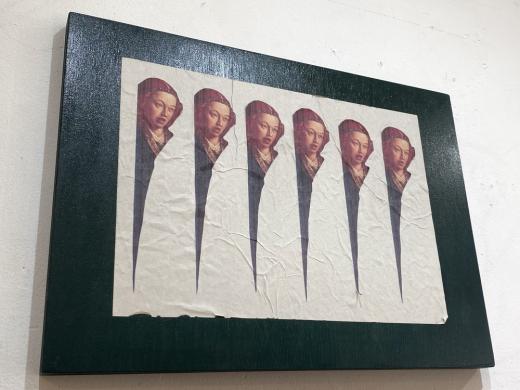 「Paper Collage」シリーズは、「Repetition」シリーズをはじめとする油彩やテンペラの絵画を制作する過程で誕生した、ドローイングに代わる作品になります。本作はヤン・ファン・エイク『ヘントの祭壇画』を引用しています。