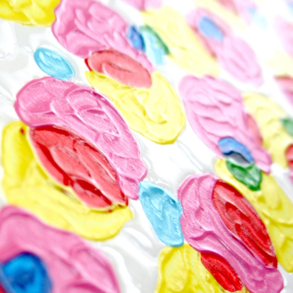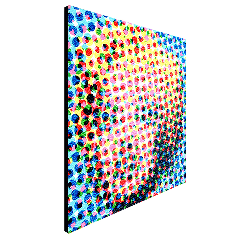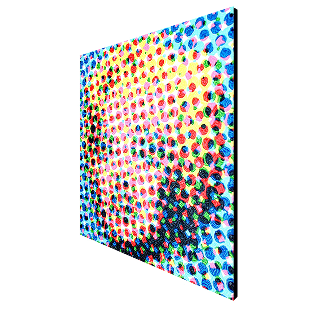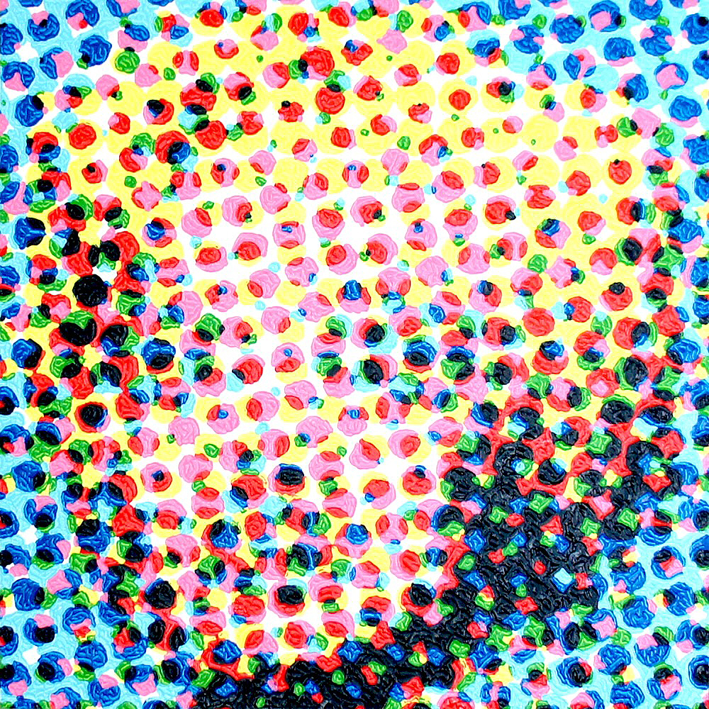 This is not a coincidence. At first, I digitally disassemble the colors of what I draw. Then, I paint every dot of the colors by hand. It would be the gimmick that makes the clusters of irregular colors look like a blurred illusion.