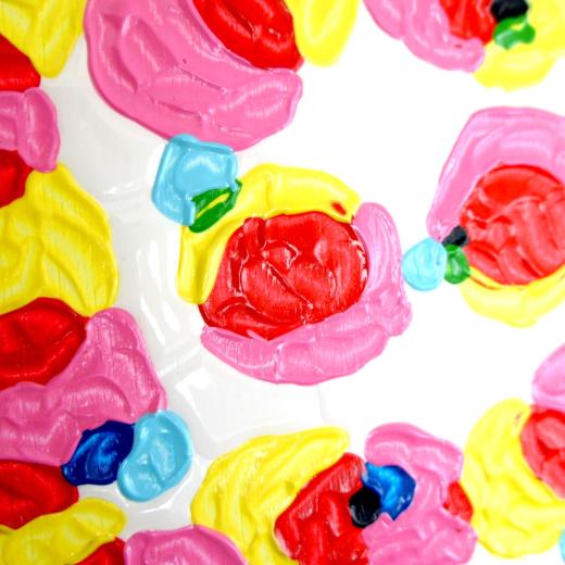 ウッドパネルにペインティングナイフとスポイトを用いてアクリルと樹脂で着色