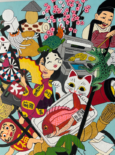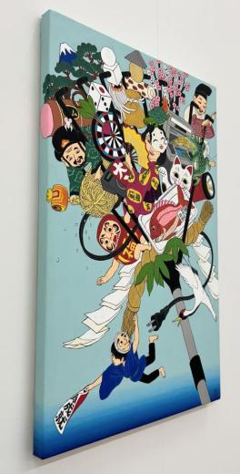 日常の瞬間を切り取った浮世絵や、物語や時間の変化を表した絵巻に影響を受け、これら日本古来の美術表現と現代の生活を”クール&ユーモア”をモットーに掛け合わせた、終わりのないアニメーションを絵画として描いています。